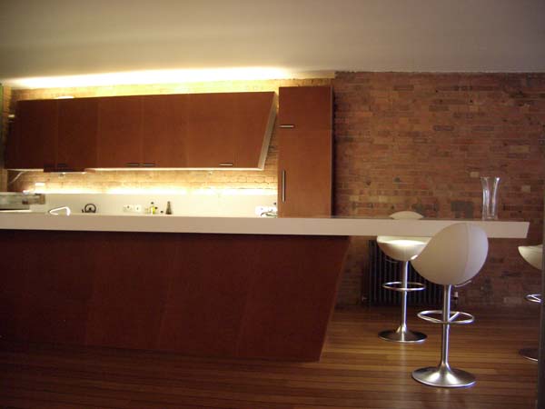Beech wood and glass walls as well as a striped, ship-deck floor enclose this comfortable two thousand square foot loft. The kitchen features a sinuous, corian topped island wrapped in tan leather.